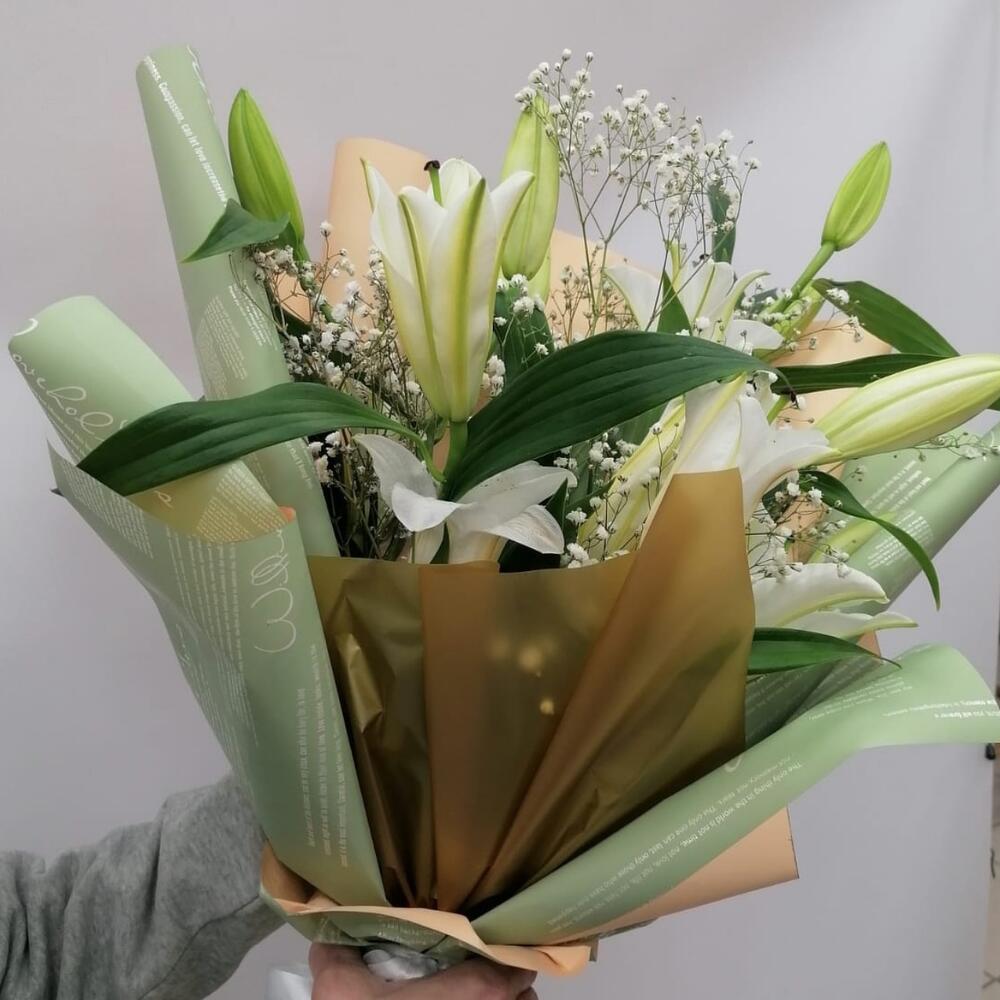 Гипсофила - 1 шт. Лента атласная - 2 шт. Лилия белая - 3 шт. Упаковка дизайнерская - 3 шт.